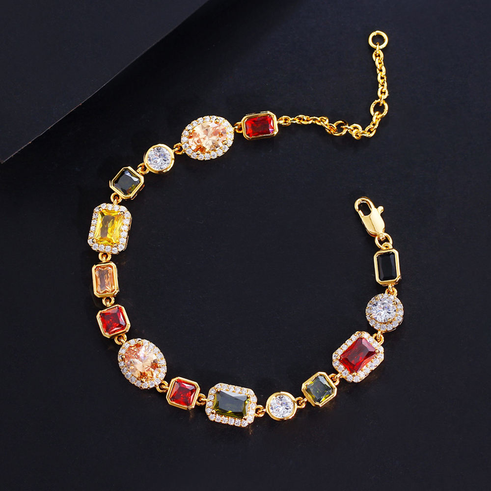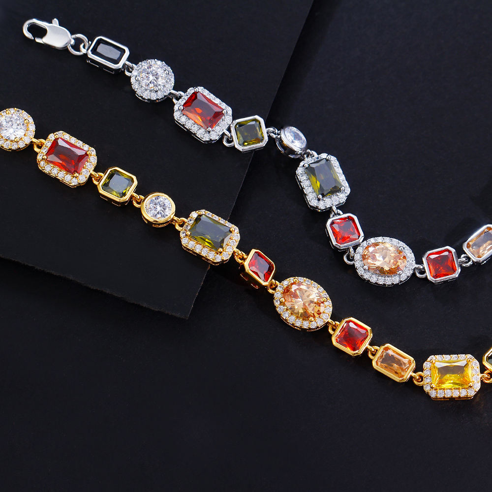 Turn every movement into a sparkle moment with the Aurora Luxe Multicolor CZ Link Bracelet. Designed for women who love bold elegance, this trendy chain-link bracelet features a captivating mix of oval, square, and emerald-cut zircon stones in rich, vibrant tones.