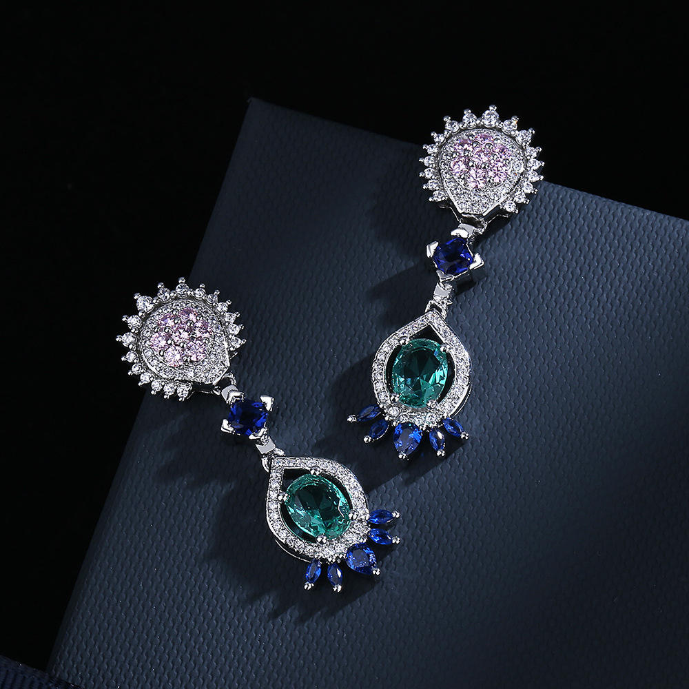 Add a touch of luxury to every look with the Aurora Royale Multicolor Zircon Drop Earrings. Designed for modern elegance, these earrings blend refined craftsmanship with vibrant sparkle. The platinum-plated finish delivers a high-shine silver tone, while the oval-cut zircon centerpiece is framed by precision claw settings that enhance brilliance from every angle.