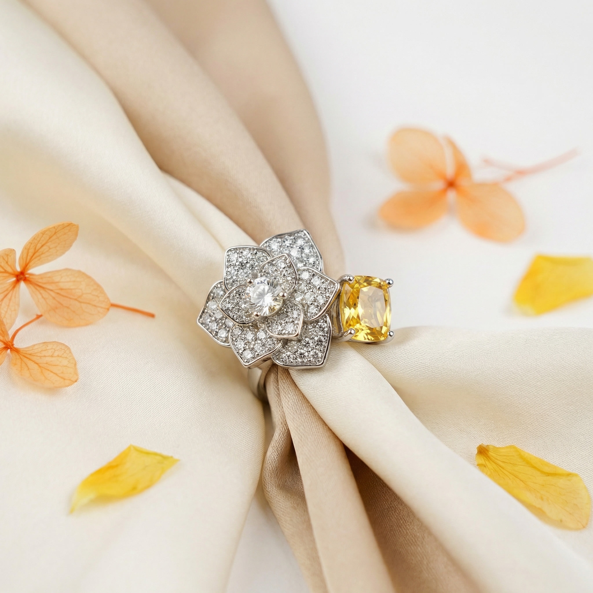 The intricate flower design, paired with a vivid yellow zircon stone and secure claw setting, showcases fine craftsmanship and a high-end look.