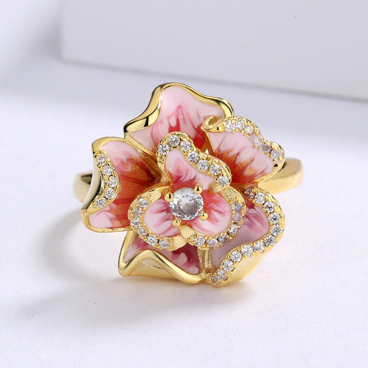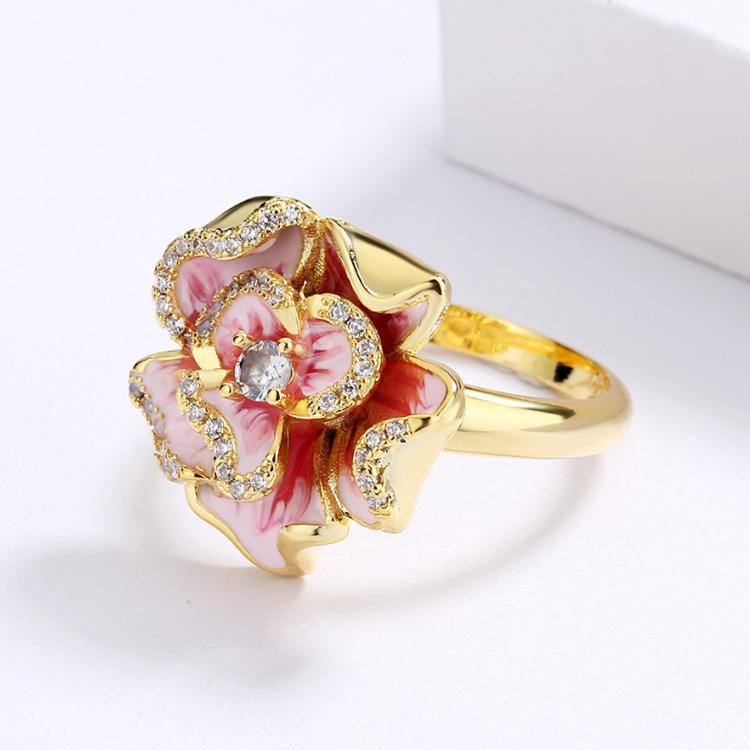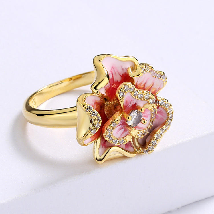 Let your style blossom with this graceful floral ring 🌷 Crafted with care, its smooth gold-tone surface wraps around a hand-painted pink enamel flower, creating a charming contrast that feels both romantic and refined. Tiny shimmering stones catch the light beautifully ✨, adding a subtle sparkle without overpowering the design.