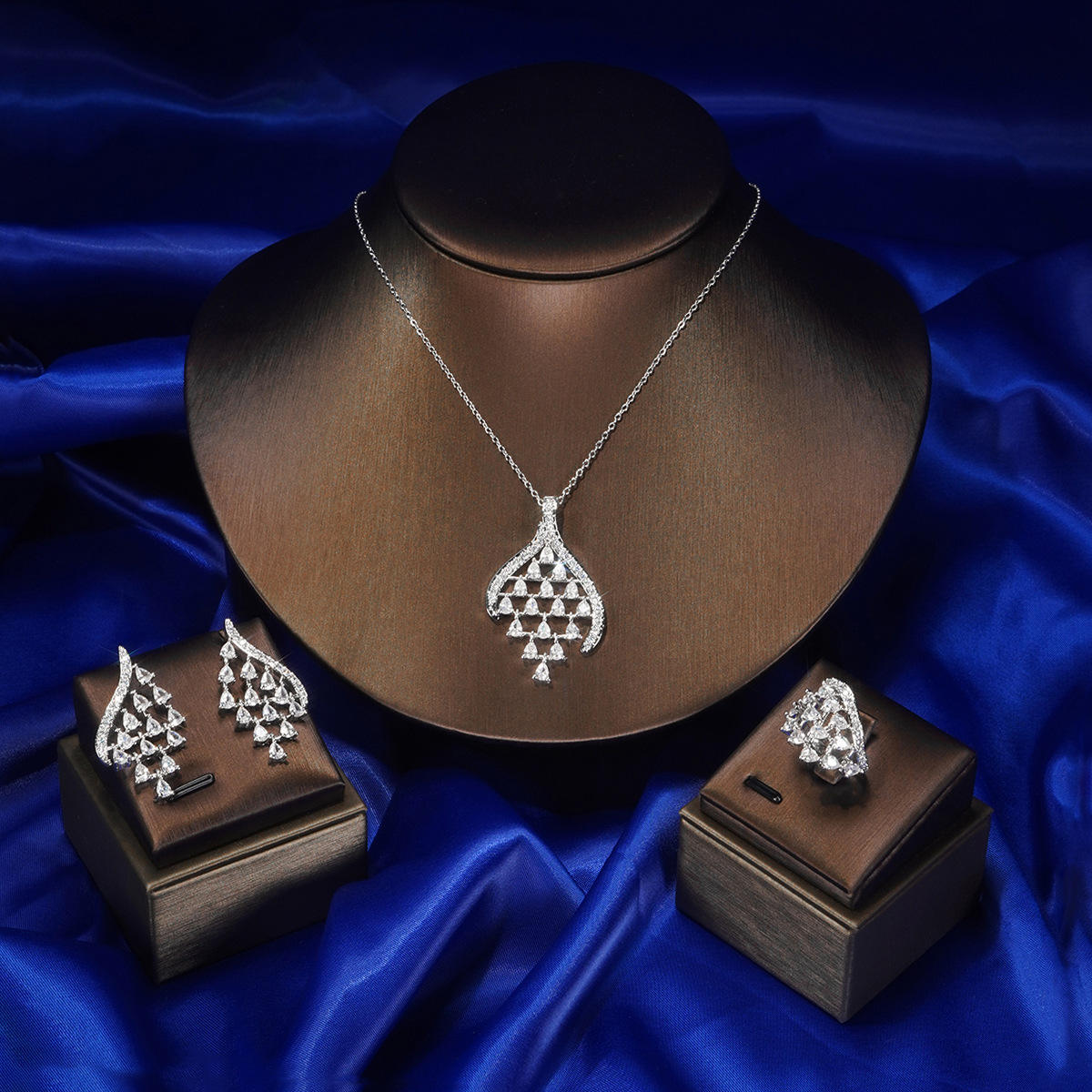 Crafted from durable brass with premium platinum plating, the set offers a radiant silver-tone shine that resists dullness while maintaining a luxurious finish. The centerpiece features carefully arranged high-quality zircon stones, securely held in a claw setting to maximize brilliance and sparkle from every angle.
