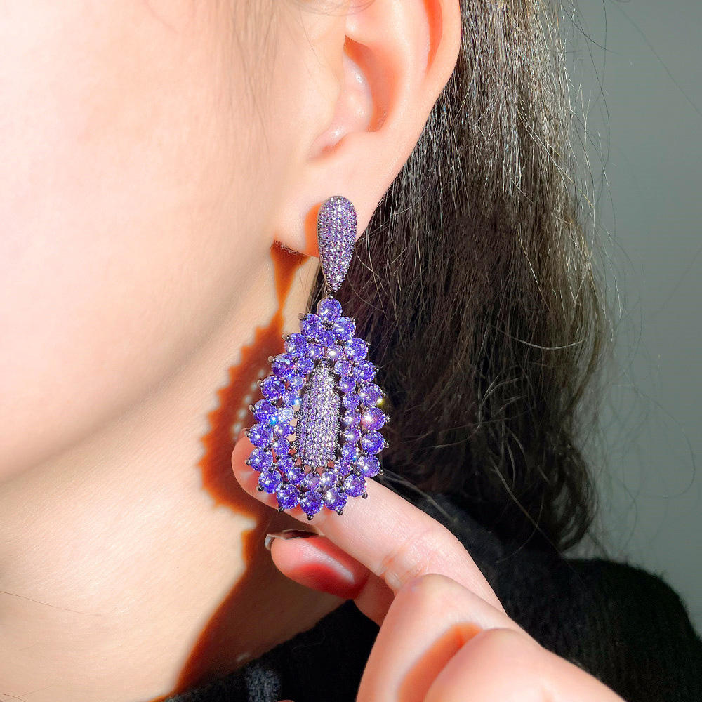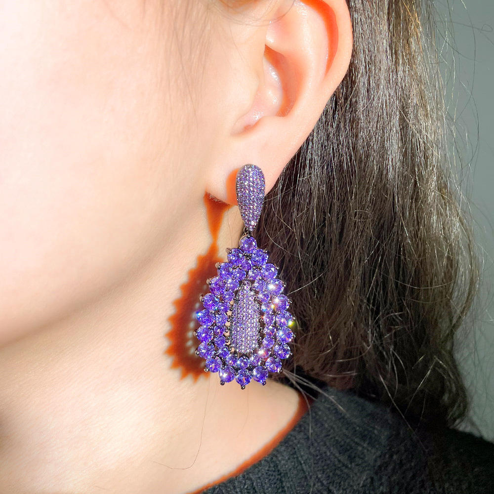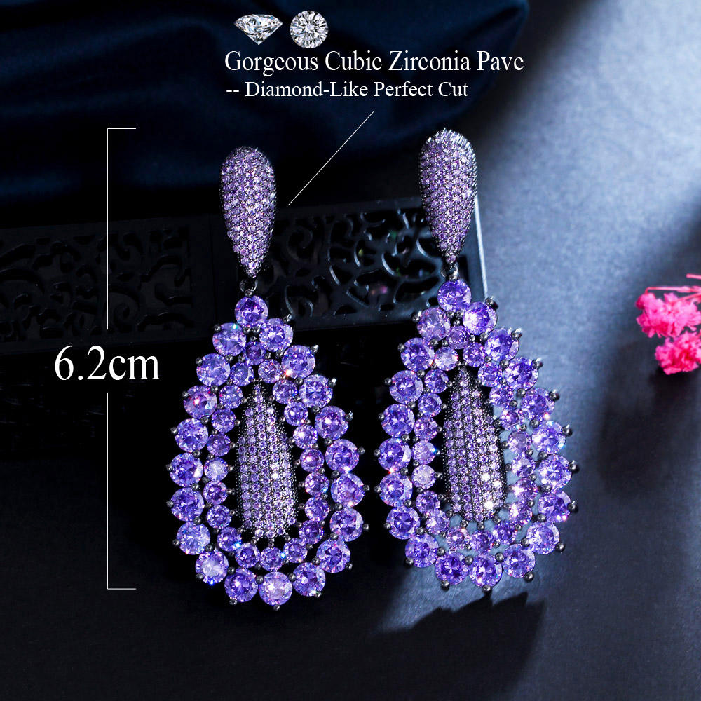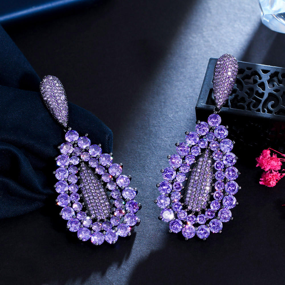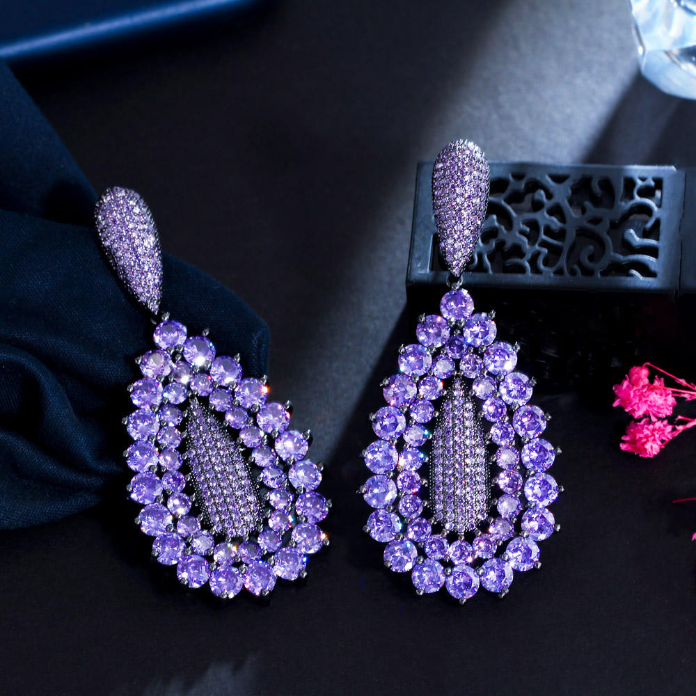 Elegant purple cubic zirconia tear-drop earrings crafted with sparkling round brilliant stones and a luxurious black gun plated finish. These statement dangle earrings add royal glamour to weddings, parties, and festive occasions.