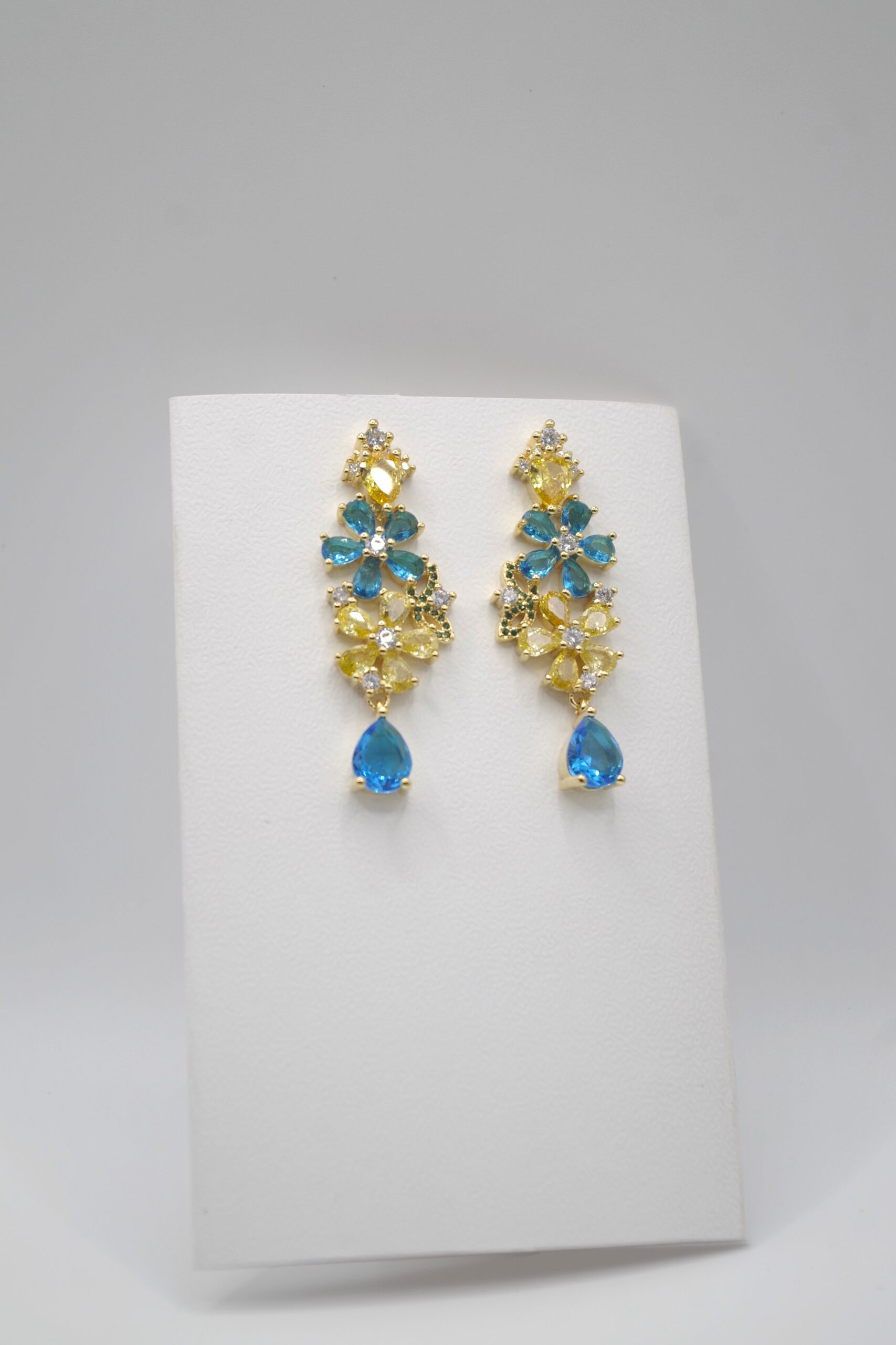 Turn every look into a statement with these Ocean Bloom Luxe Drop Earrings, designed to capture elegance, color, and movement in one breathtaking piece. Inspired by blooming flowers and ocean hues, these earrings blend blue and champagne-toned zircon stones in a graceful floral pattern that instantly elevates your style.