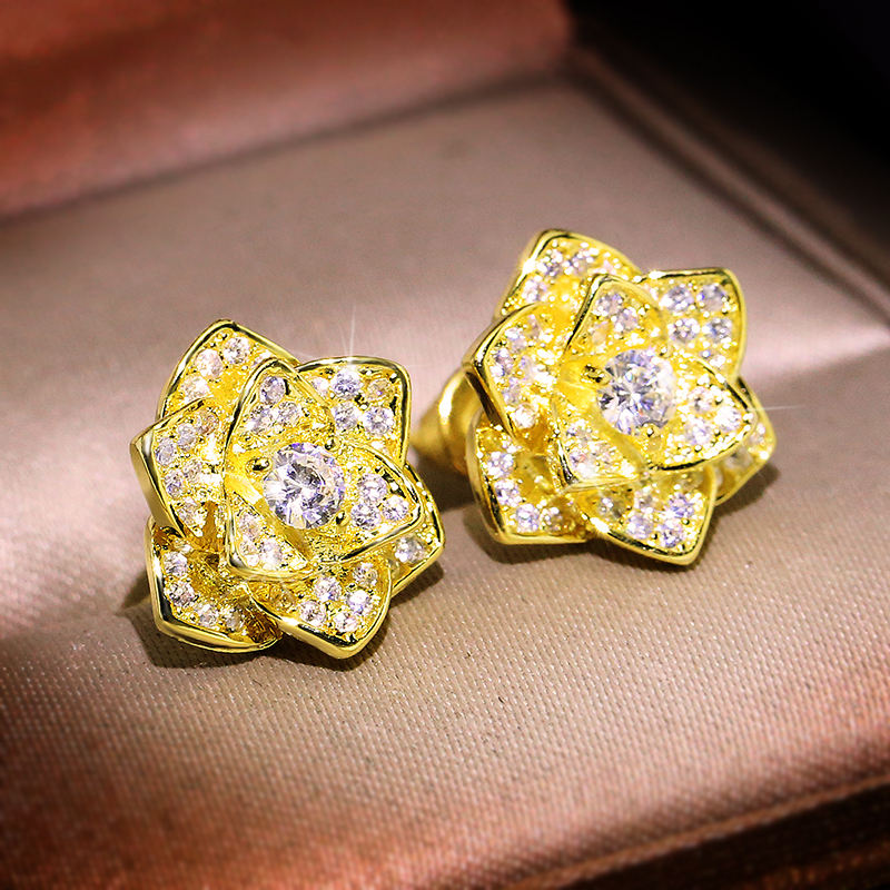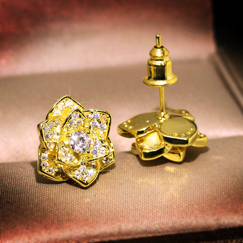 Elegant flower-shaped stud earrings crafted from premium brass, finished in rich gold plating and adorned with brilliant 3A zircon stones—perfect for weddings, parties, anniversaries, and meaningful gifts.