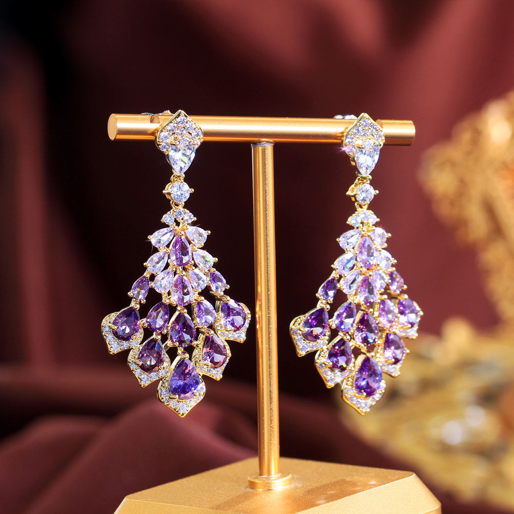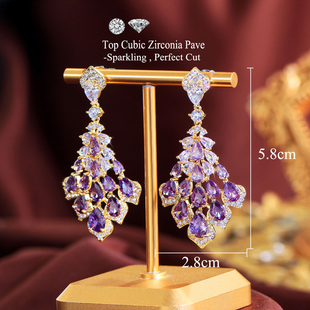 Elegant gold-plated drop earrings featuring dazzling pear-cut purple zircon stones arranged in a cascading chandelier design. Perfect for parties, weddings, and evening outfits, these earrings add a luxurious sparkle to any look.